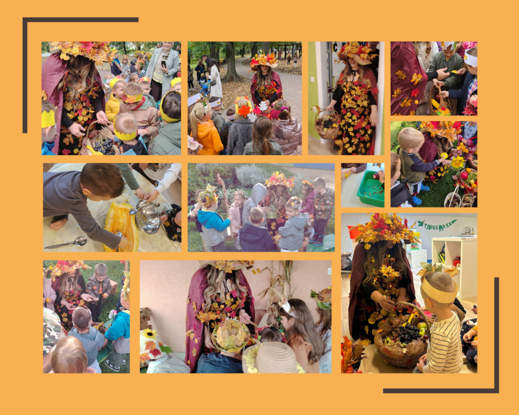 Ovaj tjedan naš je vrtić posjetila draga gošća – teta Jesenka! Djeca su ju dočekala s veseljem, a ona im je donijela košaru prepunu jesenskih plodova: šarenog lišća 🍂, kukuruza 🌽, jabuka 🍎, krušaka 🍐, grožđa 🍇, žireva i kestena 🌰.