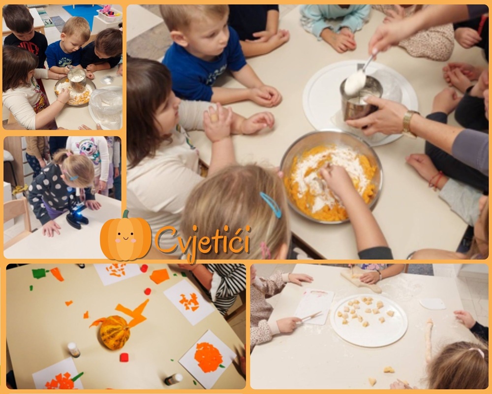 Jesen je u skupinu Cvjetići donijela pregršt boja, mirisa i okusa, a bundeva je, kao prava kraljica jeseni, postala središnja tema našeg istraživanja. U suradnji s roditeljima prikupili su tikvice i bundeve različitih boje, oblika, veličina… Cijeli tjedan istraživali su bundevu svim osjetilima kroz različite aktivnosti. Opipavanjem bundeva obogaćivali sutaktilnu percepciju, a vađenjem koštica poticali razvoj fine motorike i senzorne percepcije. Koštice su poslužile i za likovne aktivnosti te matematičke igre. Djeca su istraživala budevu pod mikroskopom, otkrivala njezinu teksturu, a zatim zasukala rukave i zamijesila ukusne njoke od bundeve.
